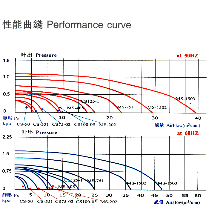 5、风机在同等功率、同等压力下,流量大。